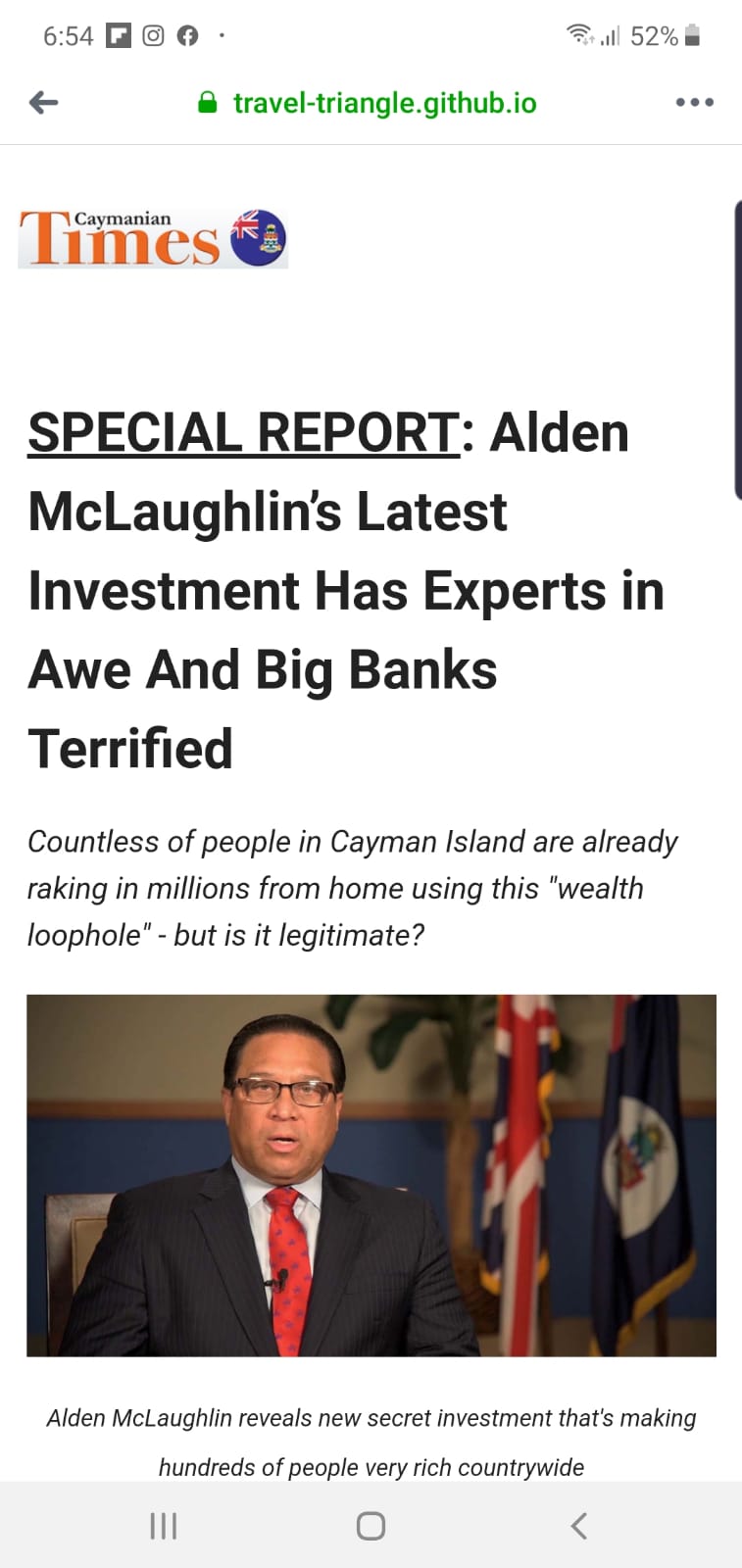 These false investment opportunities, which seem to be operating under the name “Bitcoin Era Promotions,” are scams and the Honourable Premier Mr. Alden McLaughlin is not involved in these promotions in any way. It appears that an overseas scammer has been using the name and pictures of the Premier along with mentions of other prominent persons within the Cayman Islands to increase the plausibility of the scam. The false news promotions have also been done in a similar way with other countries across the world.