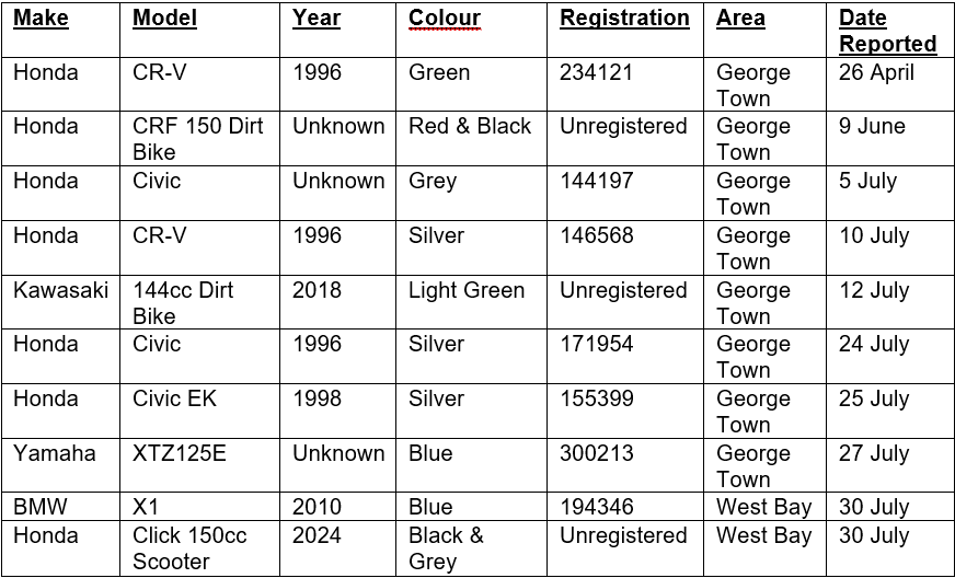 The RCIPS is also asking the public to be on the lookout for the below reported stolen vehicles, which remain outstanding: