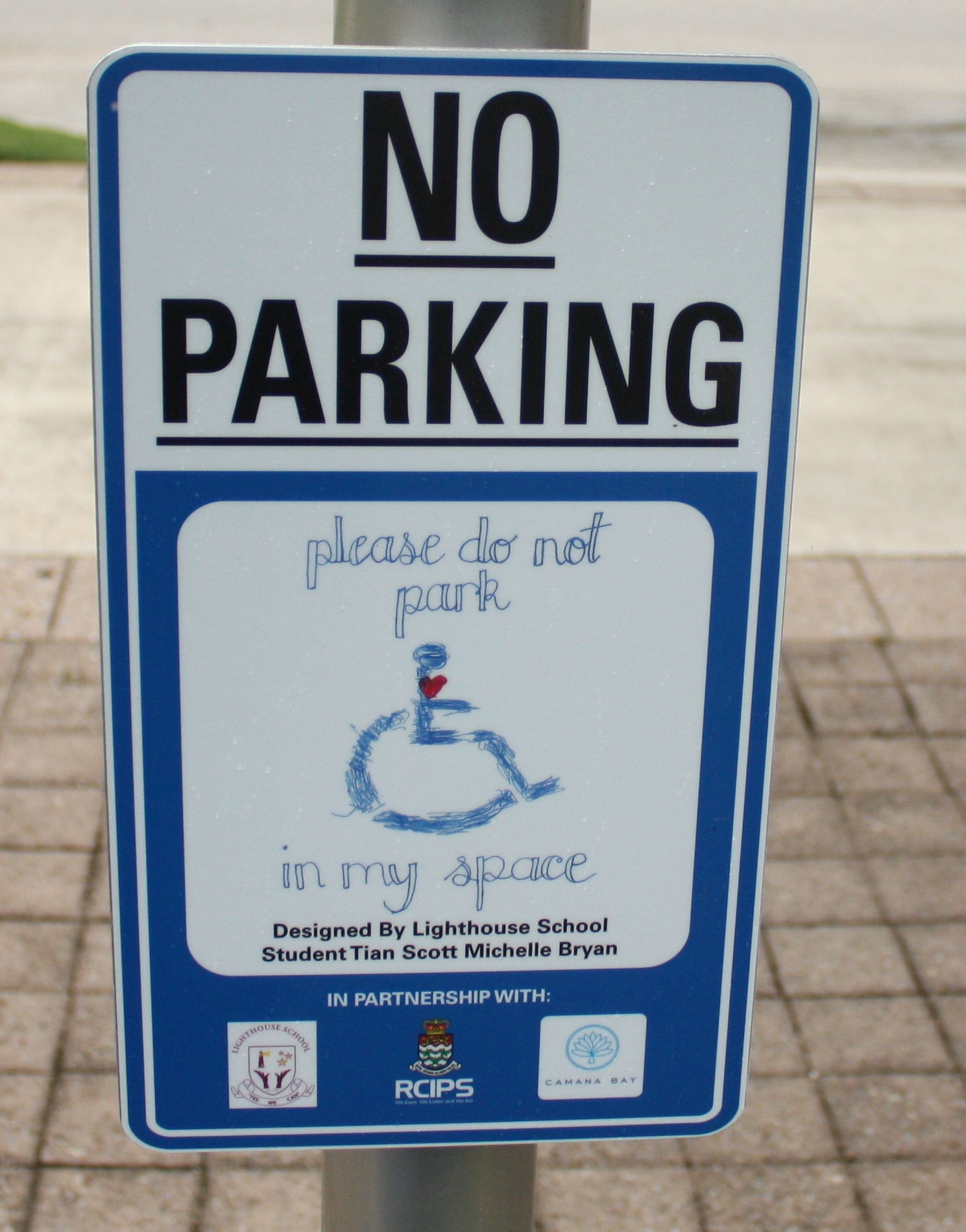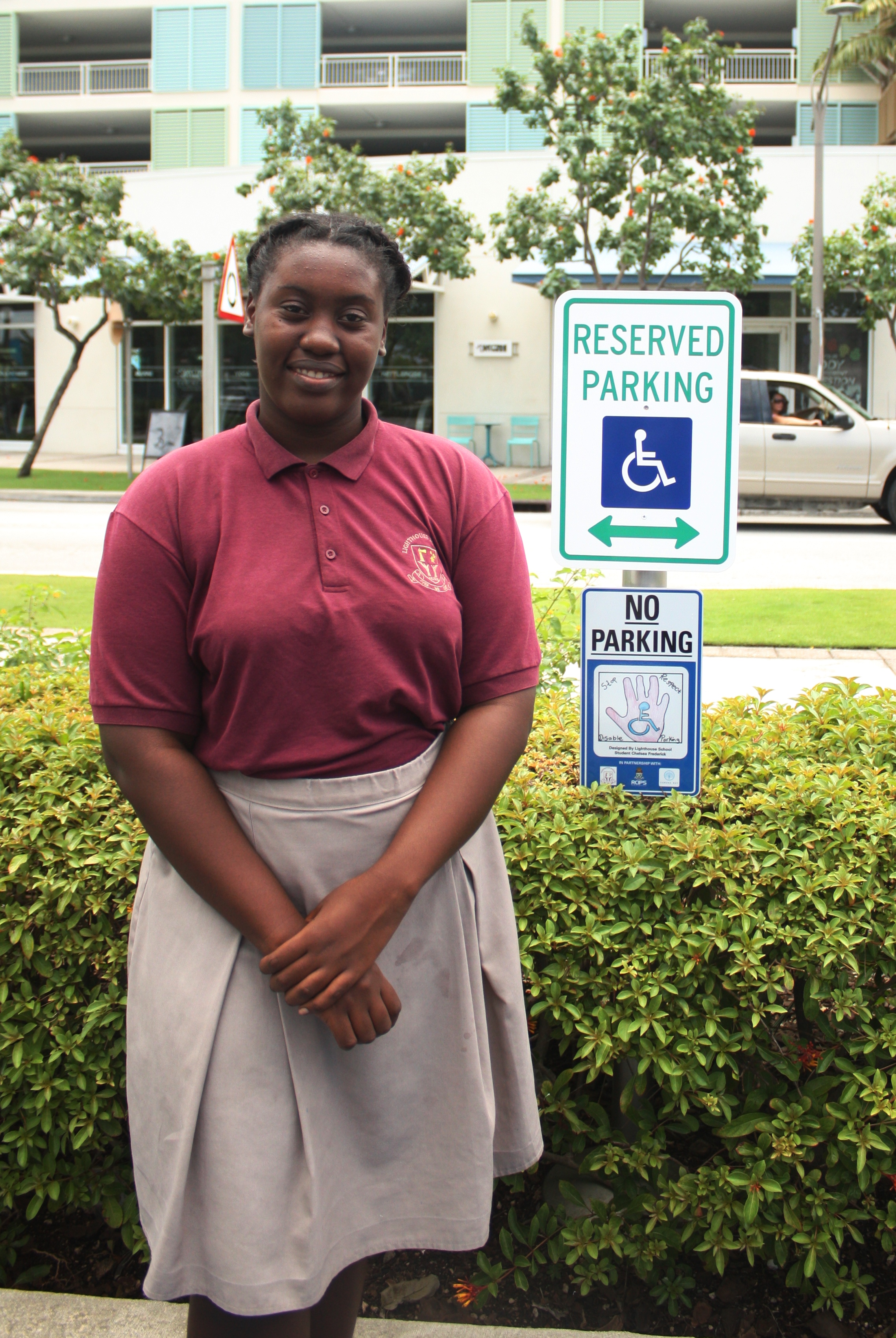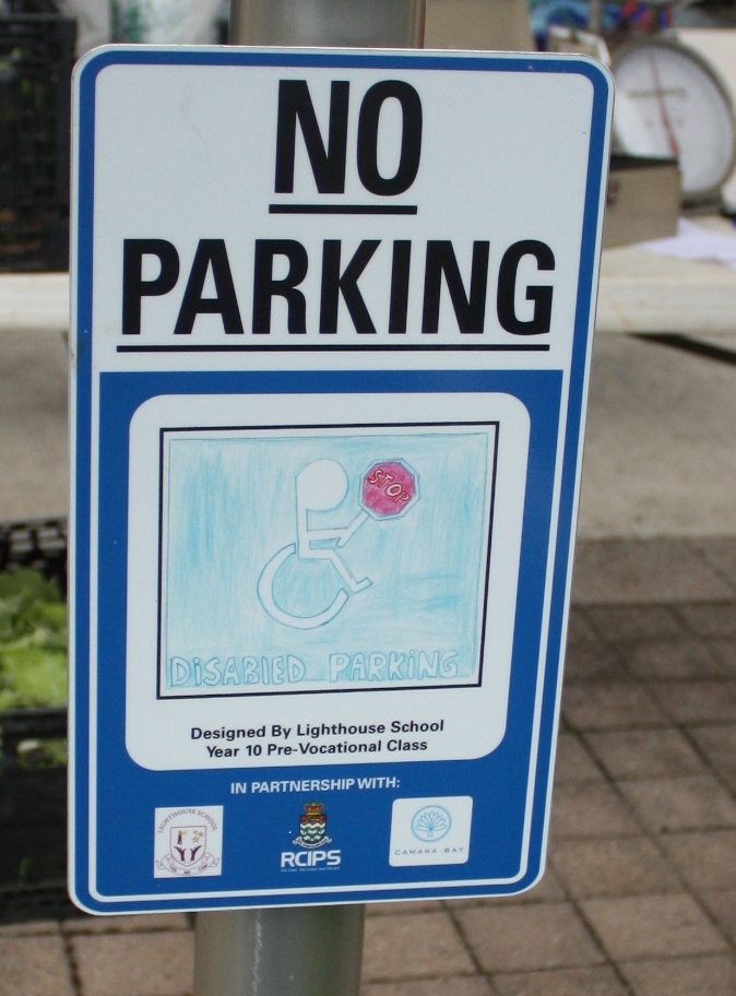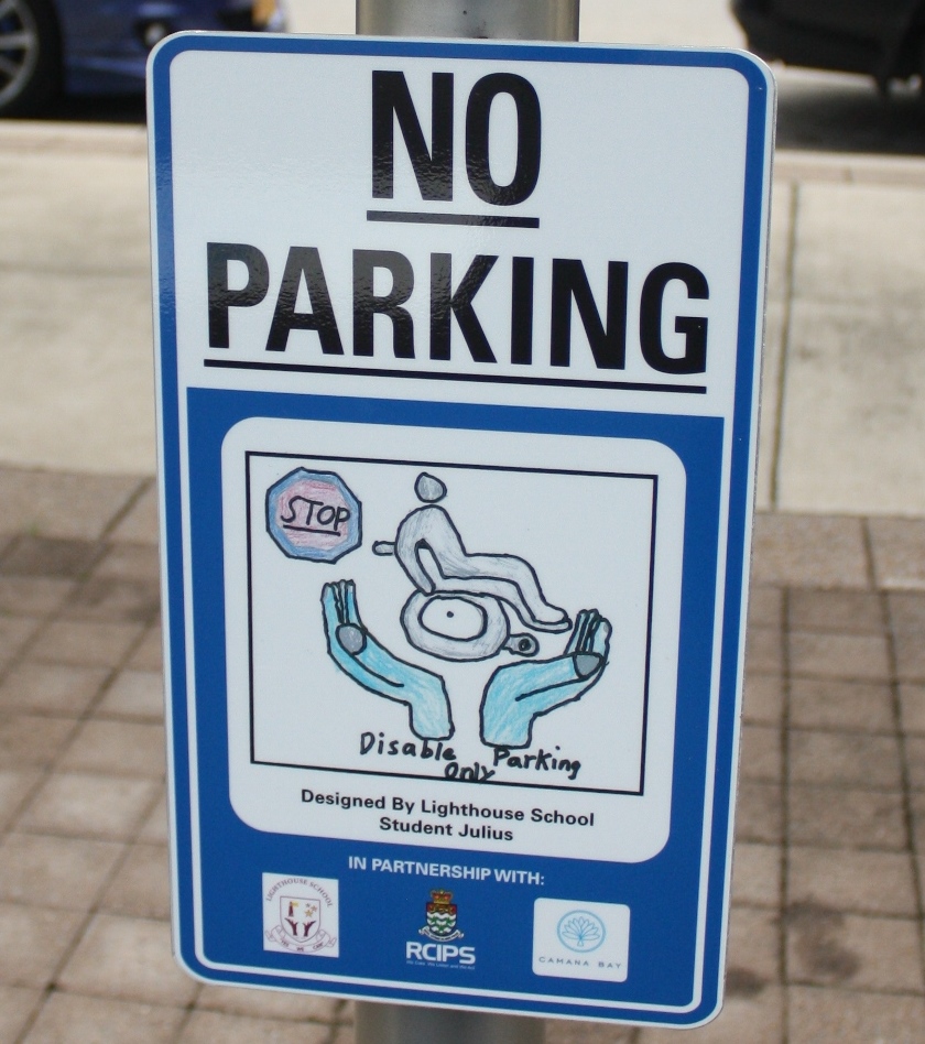 This morning, 23 May, representatives from the RCIPS, Dart Realty and the Lighthouse School, met at Camana Bay to unveil ten new disabled parking signs which were designed and illustrated by students from the Lighthouse School as part of a joint project initiated by PC Jonathan Kern, community officer for Beat 9, Seven Mile Beach South.