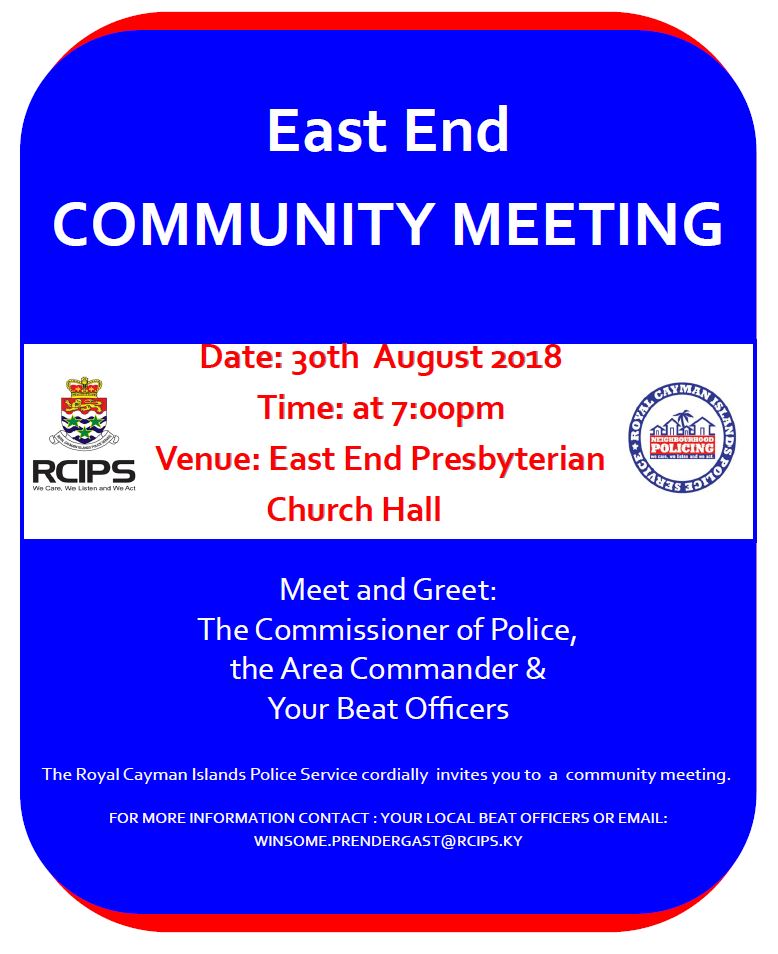 The RCIPS will be holding a District Community Meeting in East End on Thursday evening, 30 August at 7:00PM in the East End Presbyterian Church Hall.